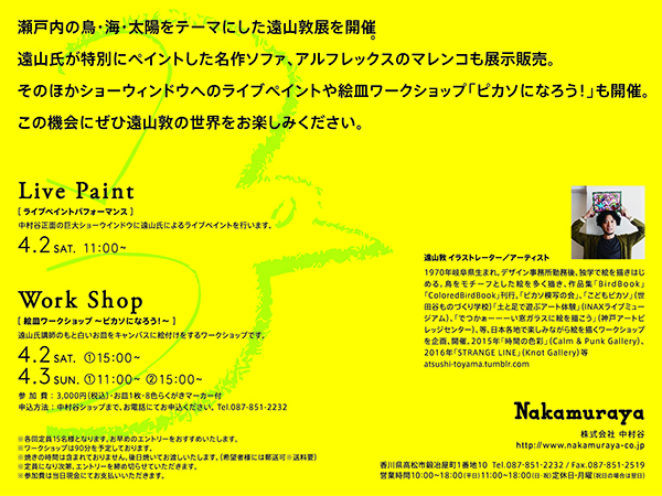 中村谷では4/2(土)から4/10(日)までのあいだ瀬戸内の鳥・海。太陽をテーマにした
