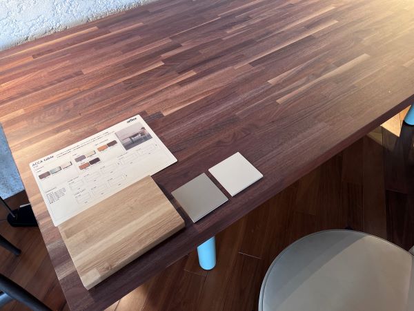 3色の脚部と組み合わせることで様々な表情のテーブルに変化します。各種サンプルもご用意しておりますので、ぜひ実際にご覧になってみてください。