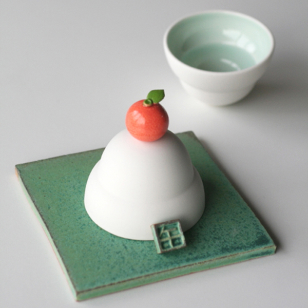 エメラルドグリーンの台皿にのった陶器の鏡餅は、玄関先やちょっとしたスペースにも飾っていただけます。