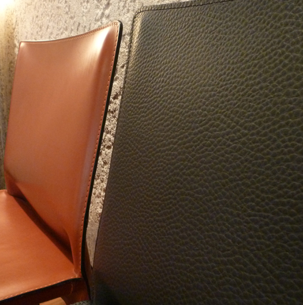 座り心地の差はほとんどありませんが、エンボス革の方が背面のしなりが少し強く柔らかいです。