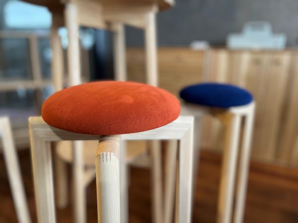 マッシュルームスツールはキッチンや洗面所などの「ちょっと腰掛けたい」という思いを叶えるスツールです。高さはL(650mm)、M(600mm)、S(550mm)、SS(500mm)の4種類。キッチンやカウンターでの使用にぴったりなサイズ感で、スタッキングもできるため収納時も場所を取りません。座面の張地は撥水性のあるスエード調人工皮革のため水場でも安心して使えます。全5色よりお選びいただけます。脚と幕板の接合部分にフィンガージョイントを採用して、金具なしでも十分な耐久性を確保。4本のネジで座面と脚を固定することで組み立てできるノックダウン式で、パッケージはそのままプレゼントすることもできるデザインです。