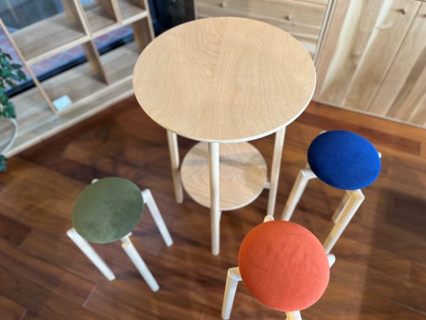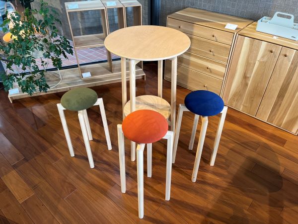 カラフルな座面が可愛らしいマッシュルームスツールと、透き通るような白さと丸い形が魅力的なマッシュルームテーブル。最近皆様にご覧いただくことが増えました。