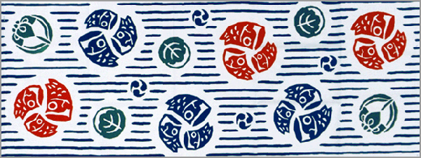 空に舞う鯉と菖蒲、柏餅を細川染めという技法を用いて大胆にてぬぐいへ表現しています。