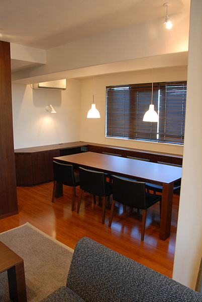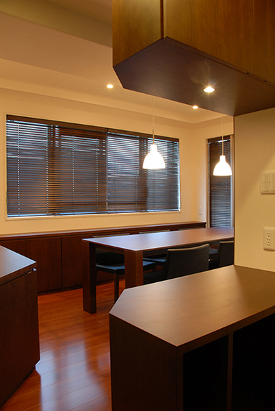 ダイニングは、6人掛けのテーブルと、その周りにはテーブルと同じ高さの収納を設置しました。